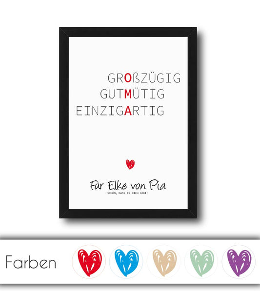 Les cadeaux personnalisés sont toujours un bon choix car ils montrent que vous avez pensé à quelque chose et que vous souhaitez offrir quelque chose d'unique. Les affiches personnalisées de 321geschenke.de sont une manière particulièrement agréable de faire plaisir à votre maman.